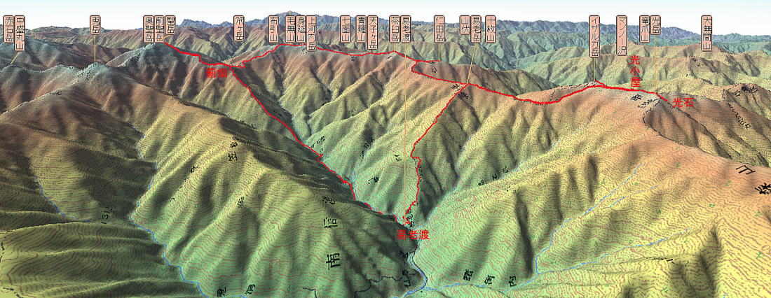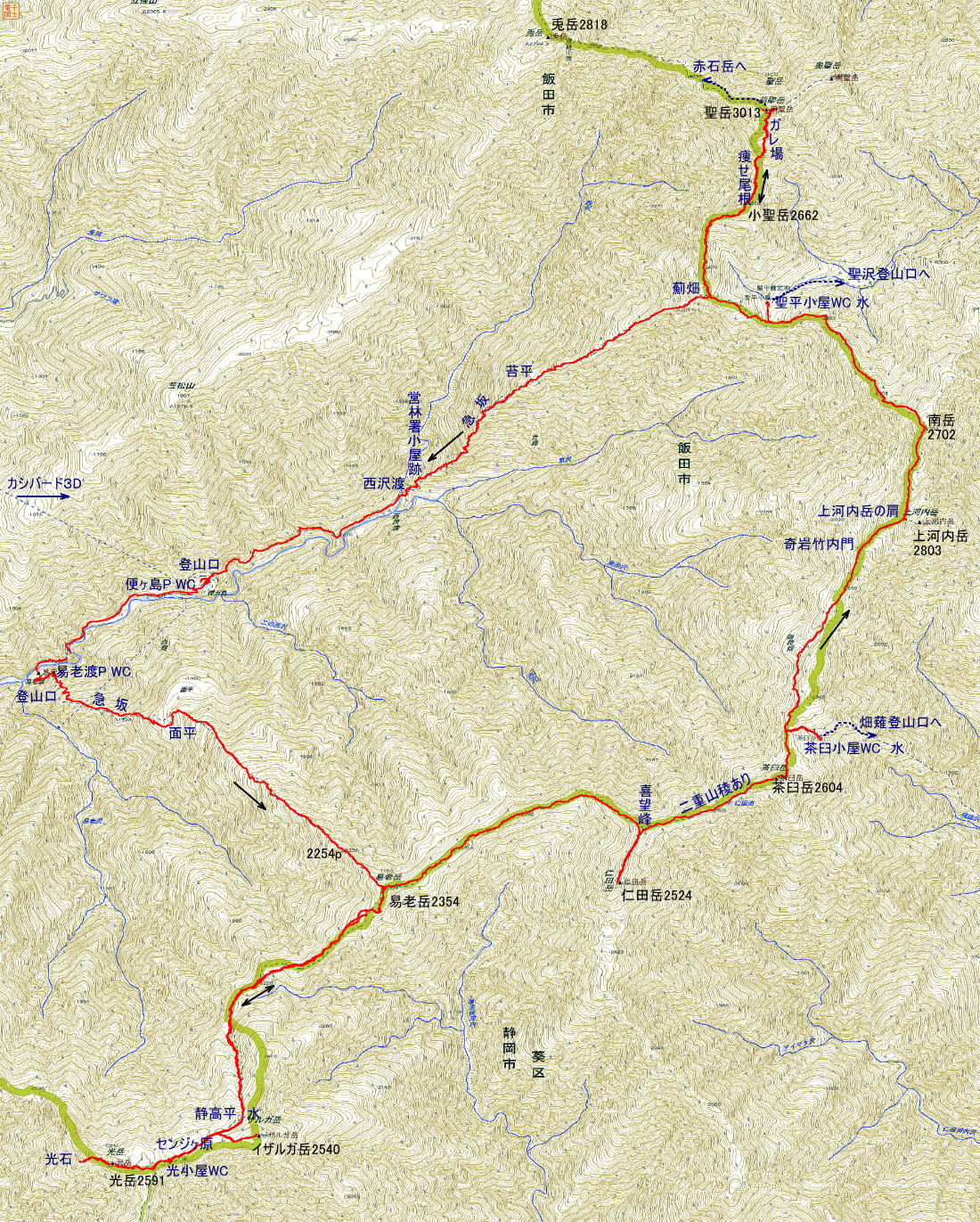 易老渡-光岳2591m-聖岳3013m-易老渡 1日目 易老渡-光岳-光小屋 歩行距離:13km 歩行時間:9時間 2日目 光岳ー聖平小屋 歩行距離:16.5km 歩行時間:9時間30分 3日目 聖平小屋-聖岳-易老渡 歩行距離:17.7km 歩行時間:8時間30分 カシバード3D