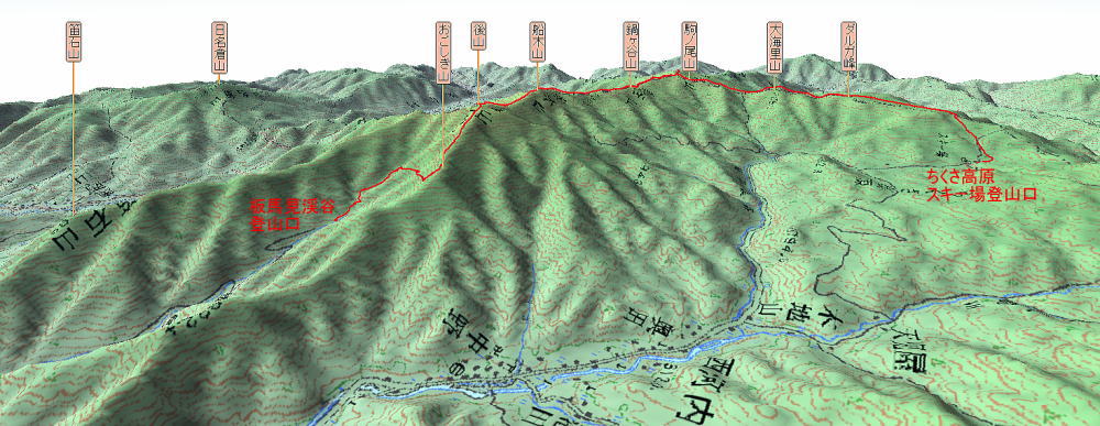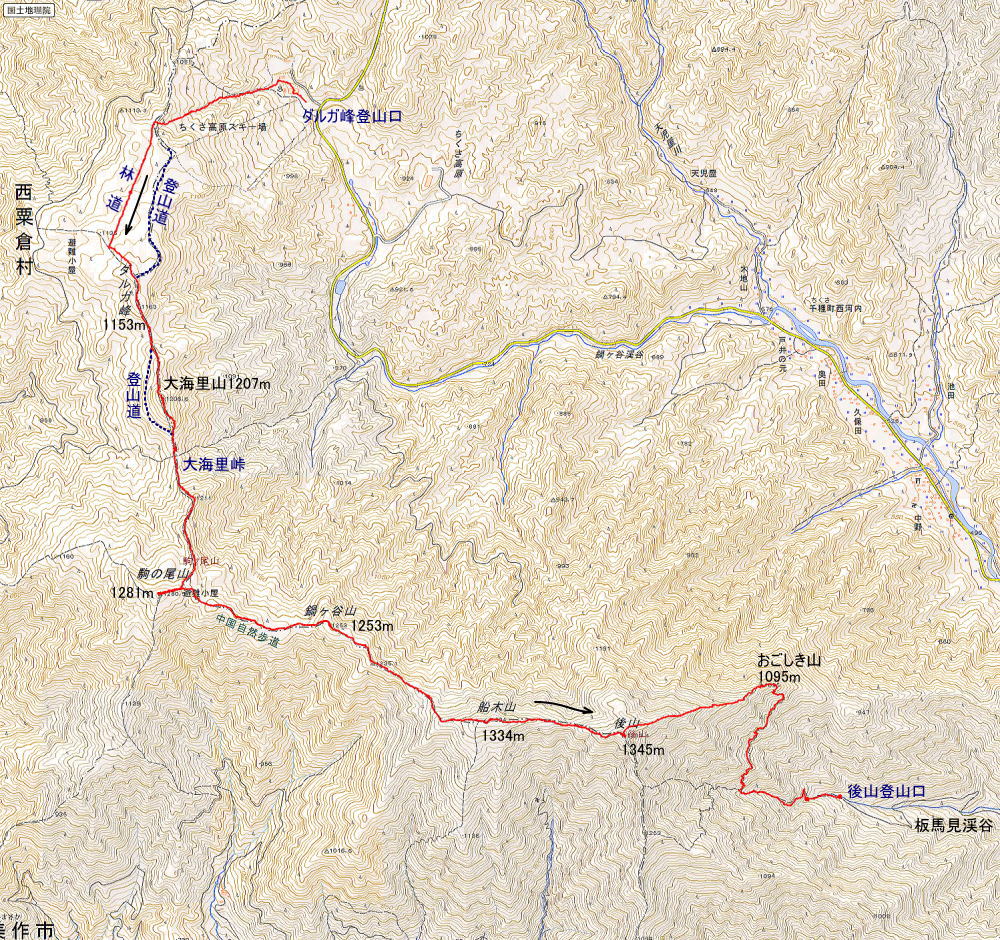 ダルガ峰1163m-大海里山1207m-駒ノ尾山1281m-後山1358m-おごしき山1095m(縦走) 歩行時間:4時間50分 歩行距離:11.2km