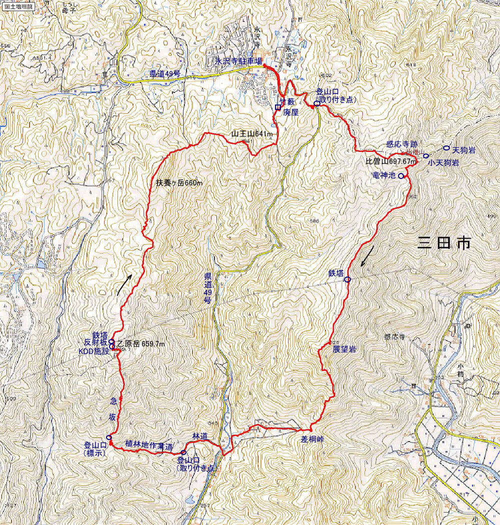 比僧山697.7m-乙原岳659.7m-扶養岳660m-山王山641m(周回) 歩行時間:5時間20分 歩行距離:10.8km