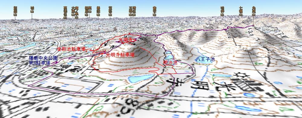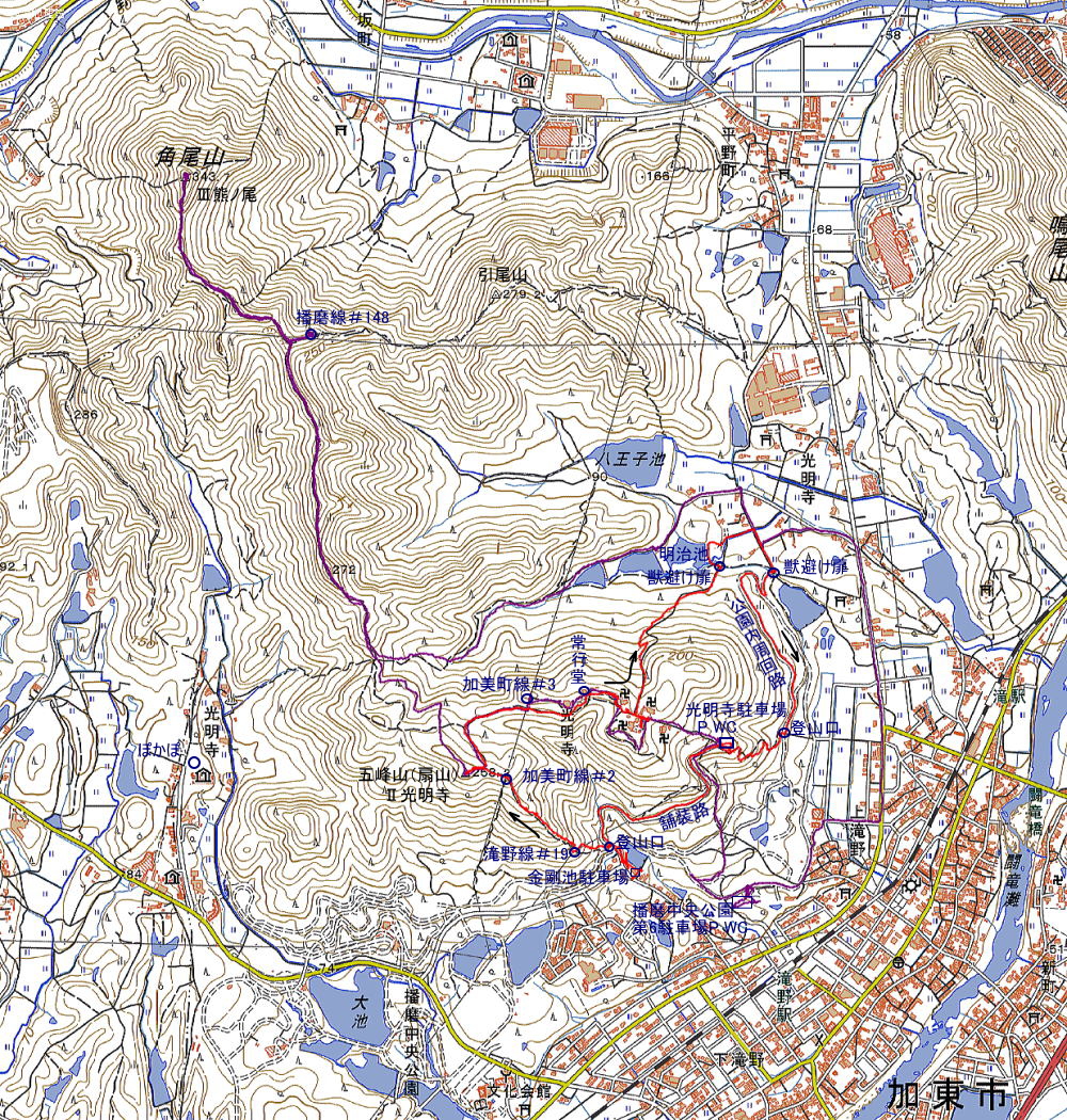 五峰山(周回) 歩行時間:2時間15分 歩行距離:5.3km (紫色のログは2/2に歩いたルート)