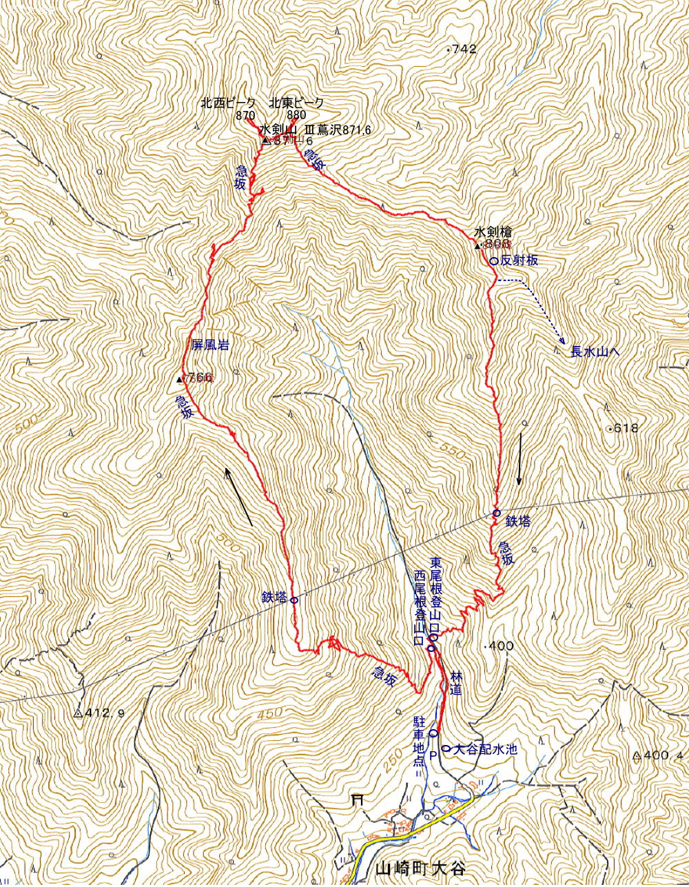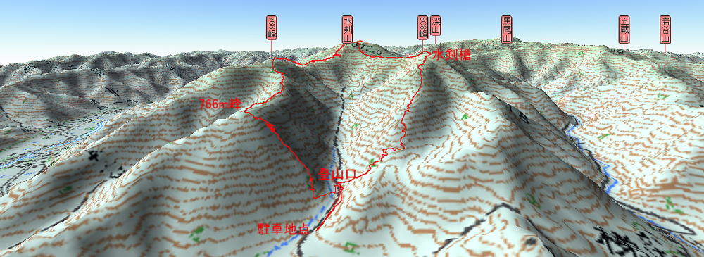 水剣山872m 歩行時間 登り:2時間40分 下り:1時間50分  歩行距離:6,5q