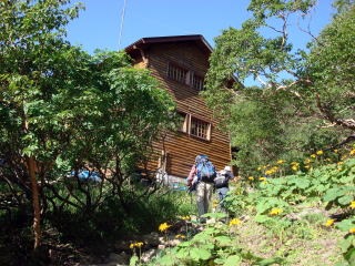 | 18日朝4時に起きると少しだけ明るくなっていた。 食事を済ませ5時20分に出発。花の多い沢沿いの藪沢新道から登ることにして、北沢峠へ戻り20分で 大平山荘へ。 |