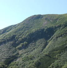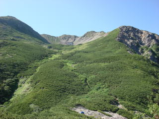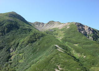 | 馬の背を登り切ると、目の前にカールを抱いた山頂が現れた。 ゆったりとした、なんとも優しい風景が広がっている。 |