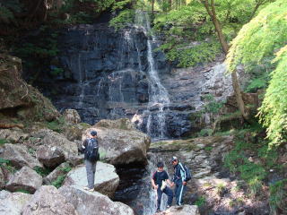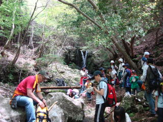 | 6年生の子供たちは余裕の下りで、後続を待っている間に何人かは雄滝直下まで探索。 | |