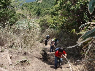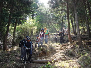 | 約100m続く急登をロープの助けを借りながら登っていく。 6年生の子供は元気良く登っていくが、小さい子供や日頃運動不足のお父さんお母さんには少しハードのよう。 |