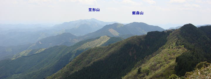 | 南西に新緑の飯森山から笠形山への稜線が眩しい。 | |