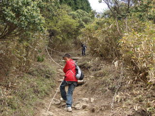 | 山頂手前の急登もロープを握って登っていく。 | |