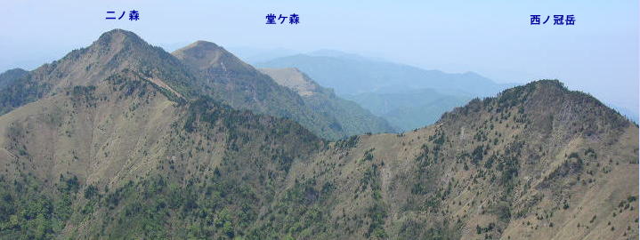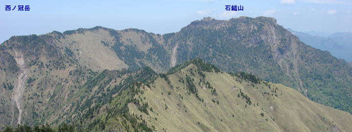 | 歩いてきた方向に石鎚山から西ノ冠岳への稜線が綺麗に見える。 | |