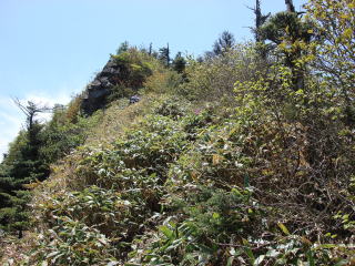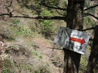| 11時:山頂を出発。 三の鎖登り口まで降りて、面河道の標識の方に向かう。 |