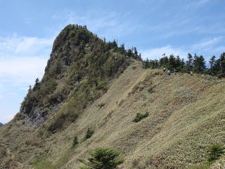 | 岩峰と笹原が続く二ノ森への稜線は進むにつれて表情が変わっていき、同じ道の往復でも飽きる ことがなかった。 荒々しい岩峰が美しい笹原にちりばめられている四国の山は、異次元の素晴らしさがある。 |
