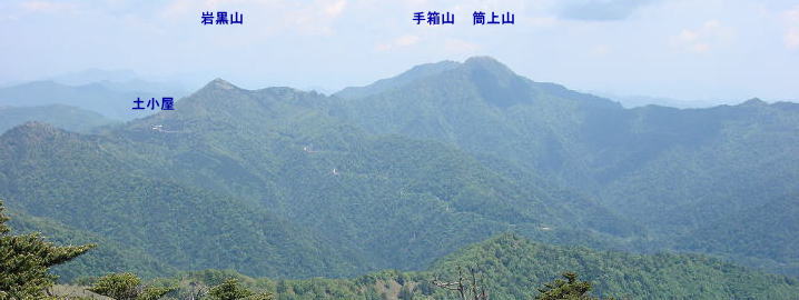 | その右手には、スタート地点の土小屋と、次の機会にチャレンジしようと考えている岩黒山から 手箱山への稜線も見える。 |