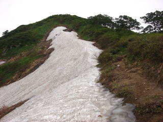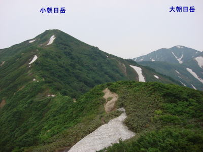 登山道にはほとんど雪はなく、唯一小朝日岳山頂手前に現れた雪道も避けて通れた。