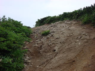 6時20分:山頂手前のザレ道を登ると小朝日岳山頂。