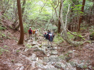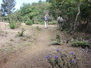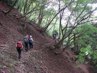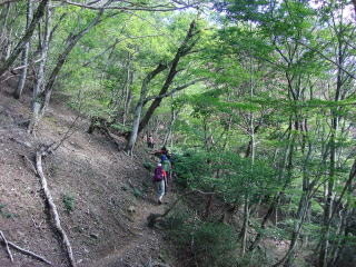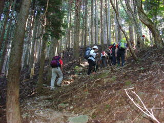 いきなり植樹林の急登が続く。1時間ほど歩くと明るい自然林になるが、相変わらず急登は続く。