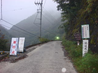 崩落現場が奥の方なら少々の林道歩きはやむを得ないと、車を走らせると約2km入ったところで通行止。