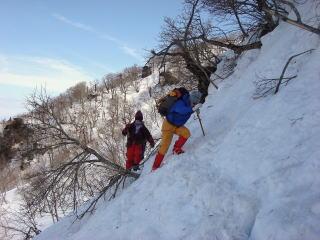 次第に気温が上がるにつれて雪も緩んでき、時々仕掛けられている深い落とし穴に足を取られながら進んでいく。