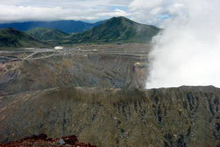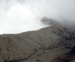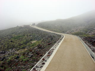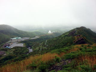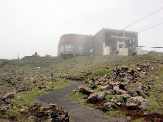| 時折雲が風に流され景色が見える。煙を噴き上げている噴火口が見え始めた。 索莫とした風景が広がっている。 |