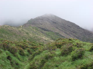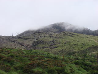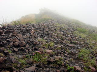 | 仙酔尾根は標高差約600mのガレ場の単調な登りで「馬鹿尾根」と呼ばれているらしい。 この日は雨上がりの雲の中で景色が全く見えないので足元だけを見ながらひたすら登るだけ。 しかし気を抜けないので馬鹿にはなれない。高度が上がるとミヤマキリシマがまだ咲いている。 |
