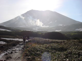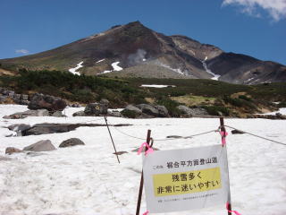 | 約6時間の周回コースだったが、登りは旭岳山頂までの1時間40分だけで、あとは花の多い道と平坦な 雪原の道なので散策気分で歩ける楽しいルートだった。 旭岳をいろんな方向から見ながら歩けるのも面白かった。 |