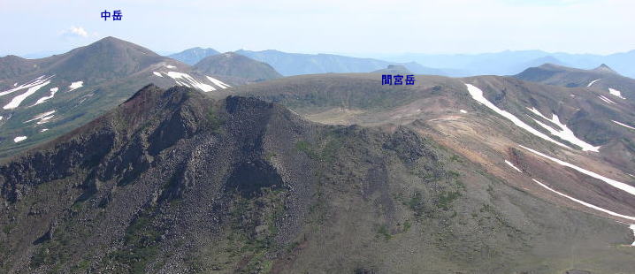 | 北側に目を転じると、これから向かう間宮岳と、中岳から遠くに黒岳までの山並みが続いている。 | |||