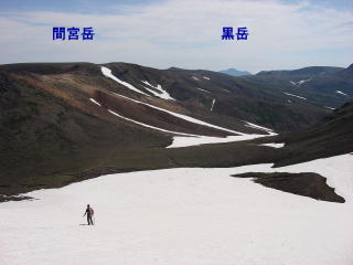 | 眺望をしばらく楽しんでから、北面の雪渓を下って間宮岳に向かう。 | |||