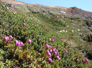 | 間宮岳に近づくとエゾノツガザクラや キバナシャクナゲなどの花の道になる。 | |||