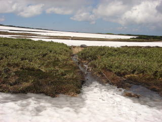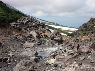| 間宮岳を下りきったところに湯気が出ている水たまりが見えてきた。 これが中岳温泉である。地図に大きく書かれているにしては意外と小さい。 中岳温泉を過ぎると広い雪原になった。 |