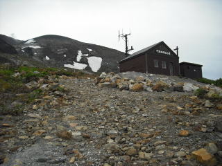 緩やかな砂礫の道を登り、美瑛岳への分岐を過ぎて少し歩くと避難小屋に到着。