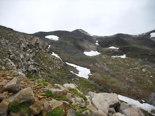避難小屋を過ぎると少し傾斜が増し、相変わらずのガレ道が続く。