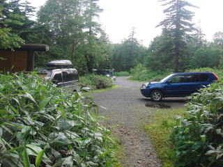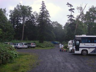 | 十勝岳を午前中に下山したので、今日中にトムラウシ温泉短縮コース登山口まで140kmを走ることにした。 明日の天気は良く分からないが、登山口で待機していれば堂にでも対応できる。 小雨が降る中、夜8時半に登山口駐車場に到着。すでに10台以上の車が泊っていた。 翌朝3時半ごろ到着したマイクロバスから降りてきた人の話声で起こされた。 外に出てみると、雨は上がっていて、多くの人が出発の準備をしていた。ここの定刻は3時半らしい。 |