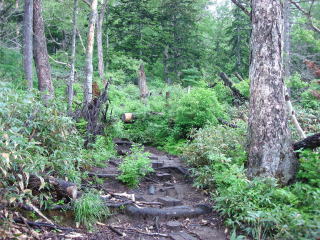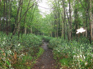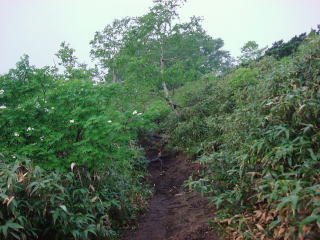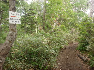 | 樹林帯の緩やかな道を登り、約1時間でカムイ天上に到着。 カムイ天上からは高木が減って視野が広がってくるが、ガスで閉ざされて何も見えない。 |