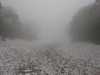 | ガスに覆われているので、道間違えをしないようにGPSで方向を確認しながら雪渓の沢を登っていく。 | |||