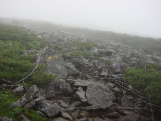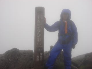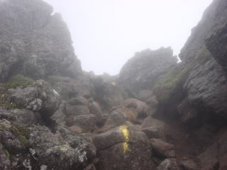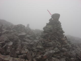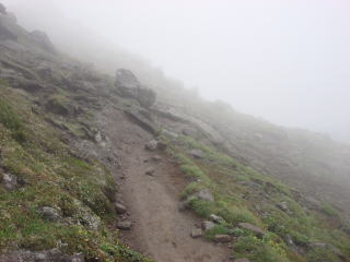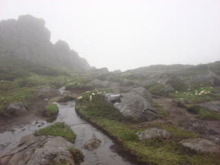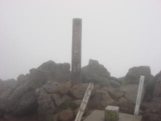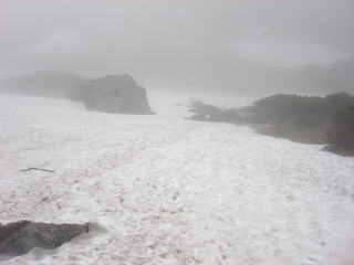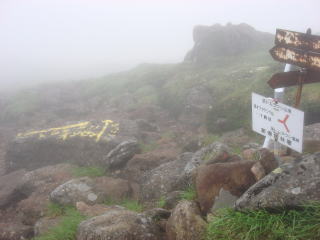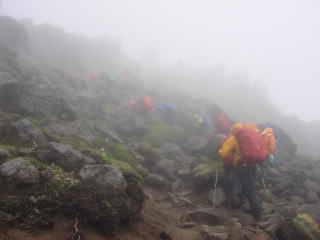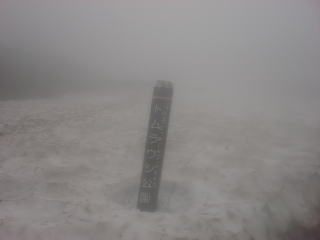 | 10時20分:6時間かかってようやく山頂に到着。しかし、何も見えない。 数人しか居れない狭い山頂で、風を避けながらガスが晴れないかしばらく様子を見るが一向にその気配 は現れない。10時50分:下山開始。 |