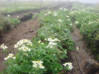 | 降りはじめたところで、20人のツアー グループとすれ違った。しばらくするとハクサンイチゲの花畑。 | |||
