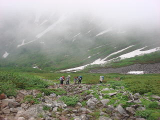 | トム平を過ぎたあたりからようやくガスが晴れてきた。登りでは全く周囲が見えなかったコマドリ沢の様子も分かった。 | |||