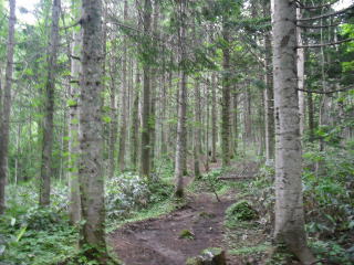 | キャンプ場を5分ほど歩くと登山口になり、しばらく針葉樹林の道を歩く。 | |||
