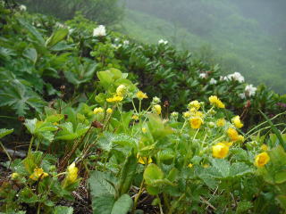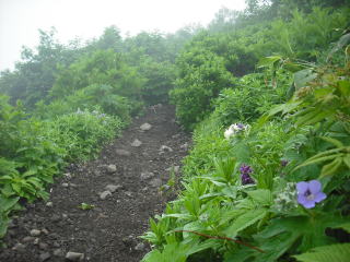 | 上がるにつれてガスが薄らいでいくので気持ちも明るくなっていく。 8合目を過ぎたあたりから花がちらほら目に着き始める。 |