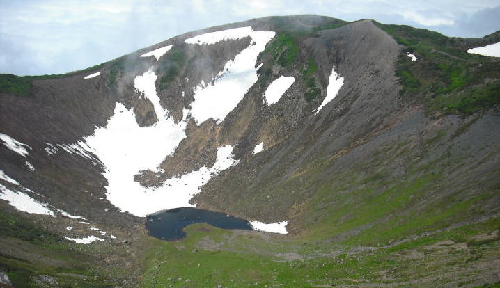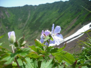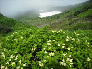 | ガスに覆われていたので期待せずに登ったが、山頂は晴れていてお花畑が見事だった。 お釜の独特の雰囲気がある山上の楽園を楽しめ、晴れやかな気持ちで下山出来たのだった。 |