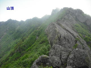 | 9時20分:お釜の淵に到着。ガスは殆ど晴れていて、山頂は雲を突き抜けていた。 | |||
