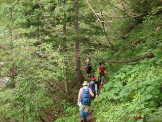 25分で大樺沢ルートとの分岐を通過し、次第に傾斜がきつくなっていく樹林の道を登っていく。