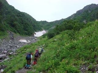 ここから八本歯のコルをめざして、大樺沢を登っていく。