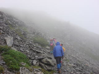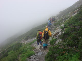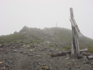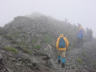 荷物をおいて、10時10分、完全にガスに覆われて景色が見えない中を間ノ岳に向かう。