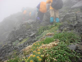 花の多い岩場の道をトラバースしていく。 次第にガスが立ち込めてきた。
