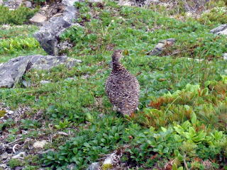 肩の小屋を過ぎたあたりで雷鳥に出会う。ガスも少し晴れてきた。