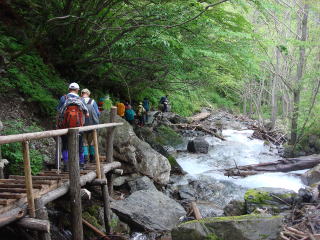 吊り橋を渡って、広河原山荘の前から登山道に入る。