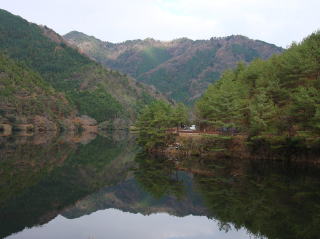 | 堰堤の少し向こうに自然公園の案内板があり、ここを右折して登っていくが、何故か登山道の表示がない。 | |