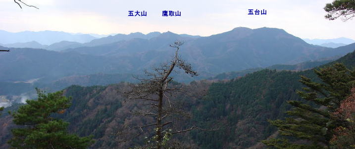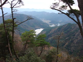 | 10時45分:大岩に到着。下を見ると大杉ダムと登ってきた尾根筋が見渡せた。 | |