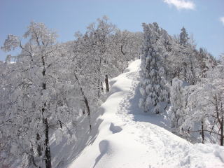 左前方にはこれから向かう三の丸から氷ノ山山頂への真っ白に輝く尾根筋が見える。
