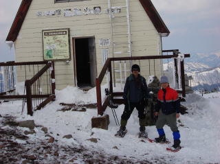 避難小屋で昼食を取り、東尾根からラッセルして登ってきたという方に写真を写してもらって、14時:下山開始。