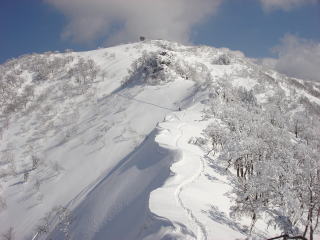 歩いて来たトレースと山頂をを振り返る。